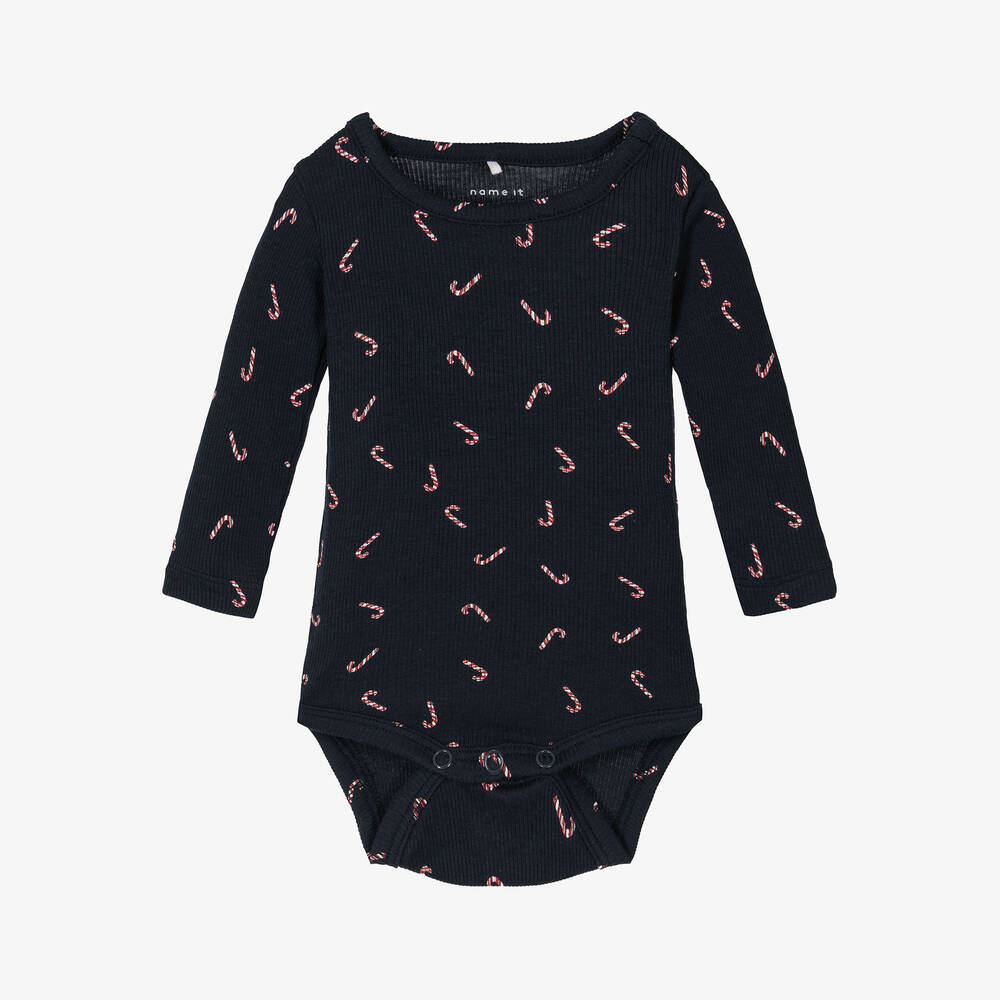 Festive navy blue organic cotton bodysuit for baby boys and girls by Danish brand NAME IT. Patterned with red and white striped candy canes, it is made in soft, comfortable, ribbed jersey. There are popper fastenings on one shoulder and between the legs, making dressing easy.