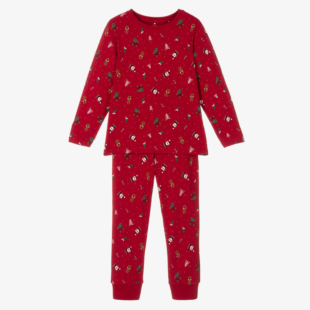Red long pyjamas for boys and girls by Danish brand NAME IT, made in soft cotton jersey. Warm and cosy, they are patterned with a fun festive print featuring Father Christmas, reindeers, Christmas trees and candy canes. The bottoms have ribbed cuffs and a comfortable elasticated waist.
