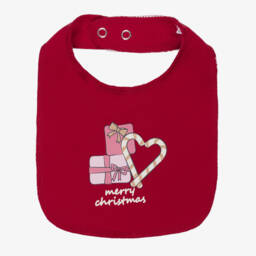 Lovely red festive bib for baby boys and girls by NAME IT, with adorable candy canes, presents and a cheerful "merry christmas" graphic. Made in organic cotton jersey with a soft brushed flannel backing, it has an adjustable popper fastening at the back of the neck.