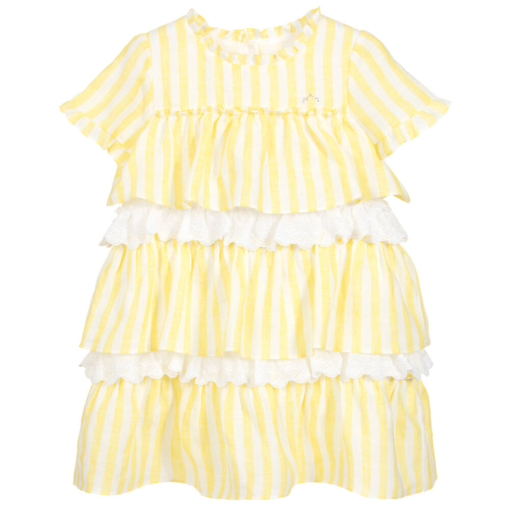 Girls white and yellow striped dress from Nanos. Made in lovely tiered layers of lace and soft linen. Fully lined in lightweight cotton, with ruffle trim on the neckline and cuffs.