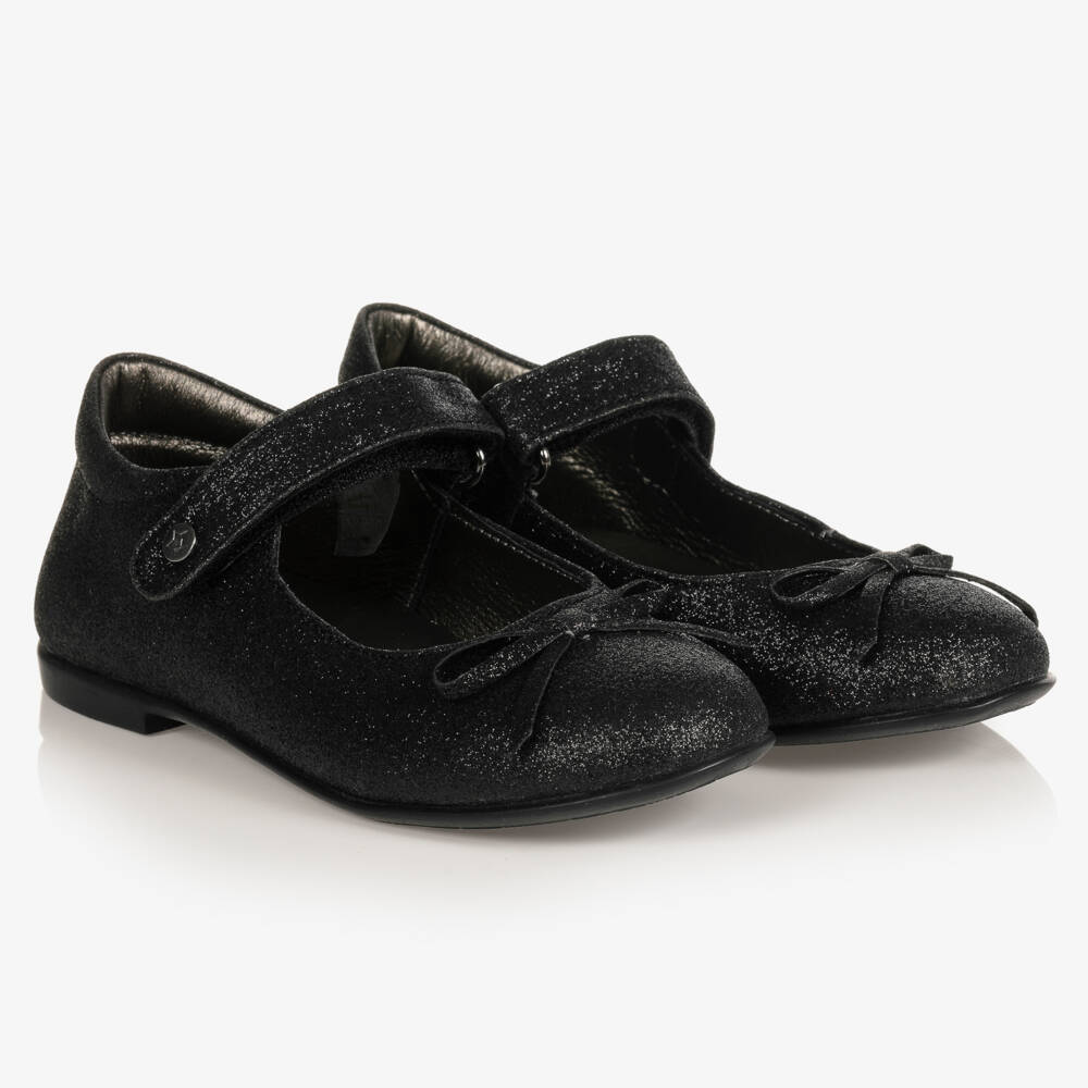 Pretty black leather ballerina pumps for girls by Naturino. The soft leather lining and slightly padded inner soles add comfort to these glitter covered shoes. They have a velcro strap fastening across the foot and a sweet tonal bow on the front.