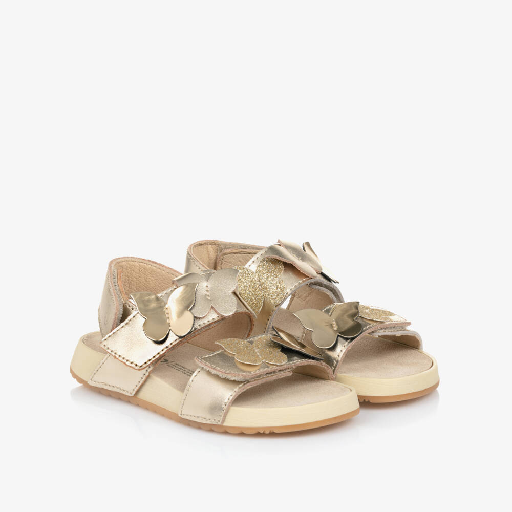 Gorgeous metallic gold sandals for girls by Naturino, beautifully handmade in soft leather. Both stylish and easy to wear, they fasten with velcro straps decorated with charming butterfly appliqués. The soft suede insole is cushioned for lasting comfort and the flexible rubber outer sole provides good grip on slippery surfaces.