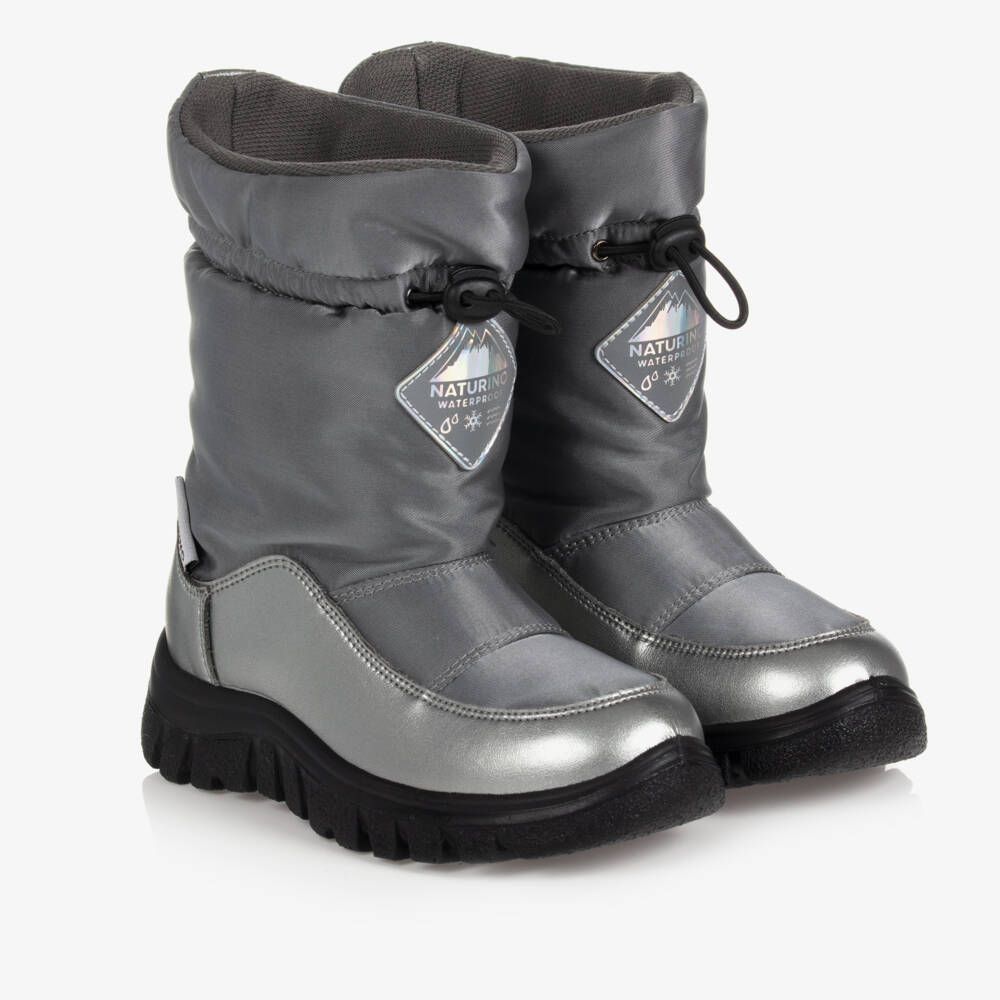 Silver waterproof boots for boys and girls by Naturino, protecting feet from snow and rain. Made in smooth nylon with faux leather trims, they are lined in woolly fleece. Easy-to-wear, they pull on and are secured with an elastic drawstring and toggle on the opening to keep the cold and snow out. The Natex waterproof membranes draw moisture out of the shoe, keeping feet warm and dry in all weather. For good grip, they have a chunky, deep tread rubber outsole in black.