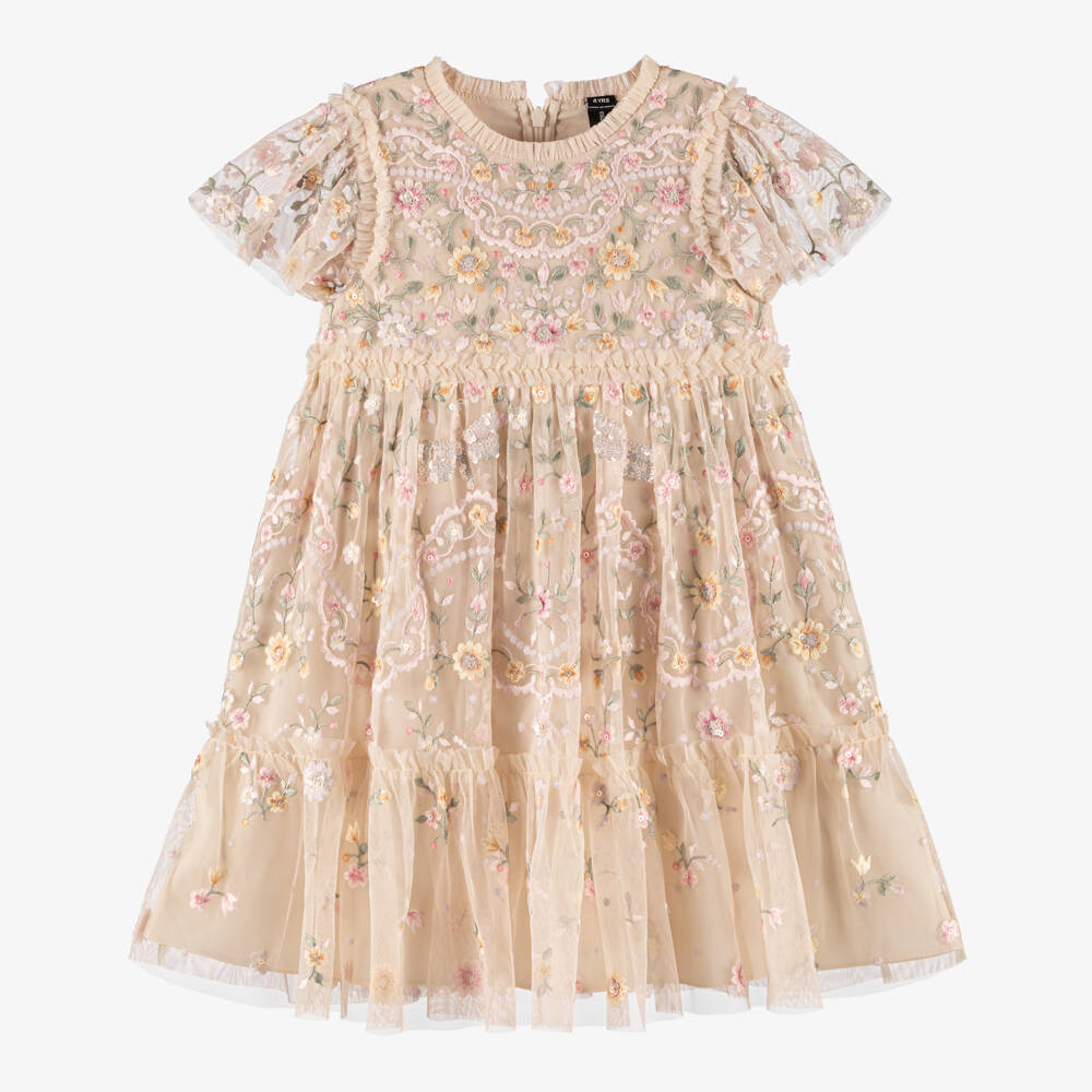 Enchanting ivory special occasion dress for girls by British luxury brand Needle & Thread, beautifully embroidered with pink, yellow and green flowers. Further embellished with shimmering pink, sequinned dragonflies, the dress evokes warm, sunny days in the garden. Sheer angel sleeves and frilly trims give the final touches.