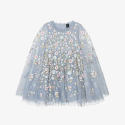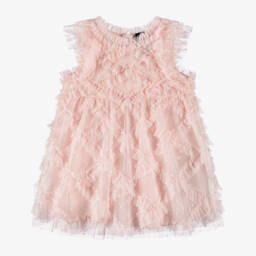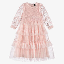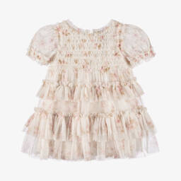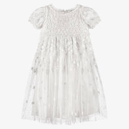 Exclusive to Childrensalon, this gorgeous ivory dress for girls by Needle & Thread is made in soft tulle, embellished with sparkling gold sequins. Ideal for a special occasion, it is designed with delicate ruffle trims, sheer three-quarter length sleeves and a concealed zip on the back. The dress is fully lined for comfort, with stiffened tulle adding volume to the flared skirt.
