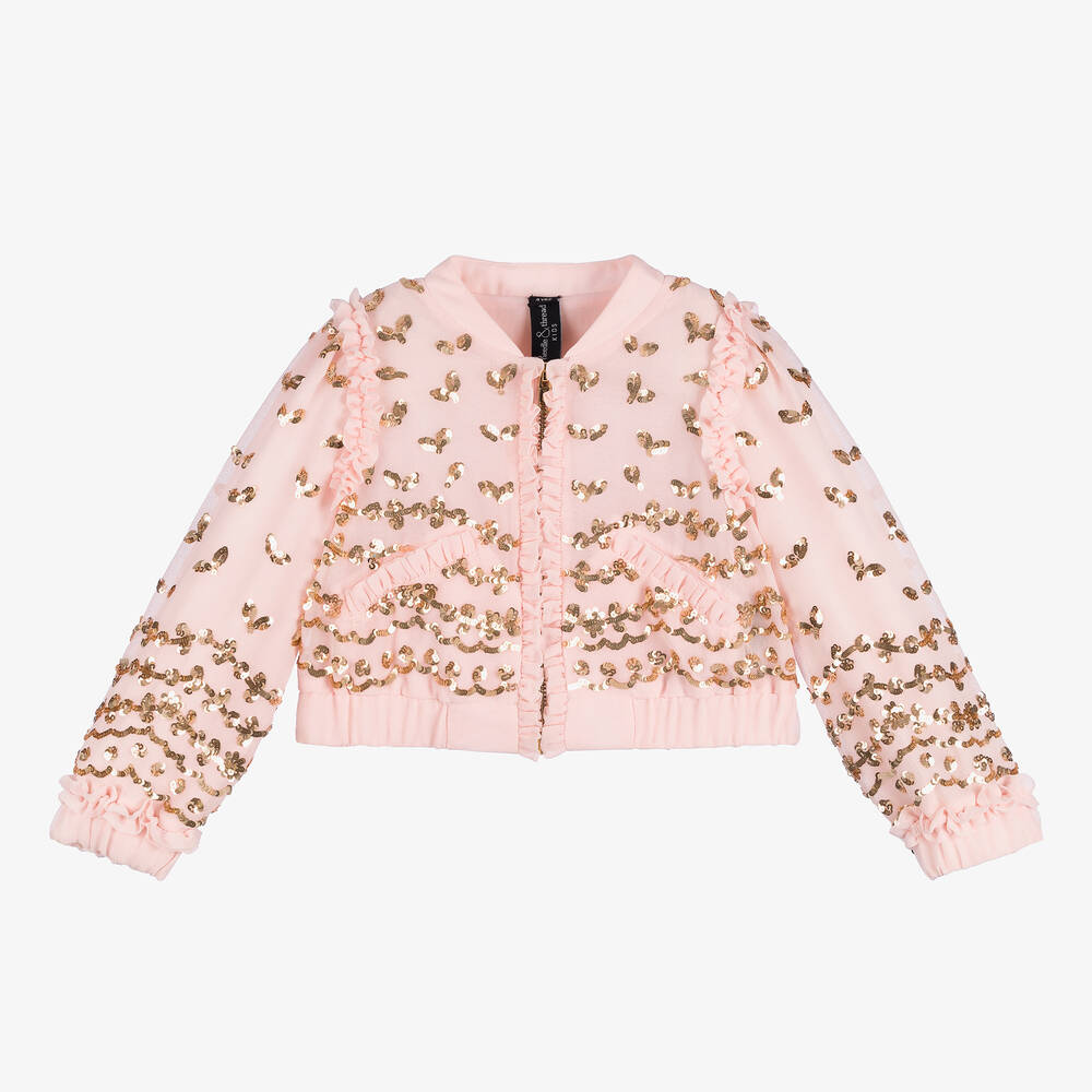 A striking pink zip-up jacket for girls by British designer Needle & Thread, beautifully designed in lightweight georgette fabric. Ideal for a party or a special occasion, this bomber-style jacket is covered with sparkling sequin leaves in a luxurious gold hue. It has fabric frill trims on the pockets and the prettiest sequin borders above the hem and cuffs. The jacket is fully lined and the hem and cuffs are gently elasticated for added comfort.