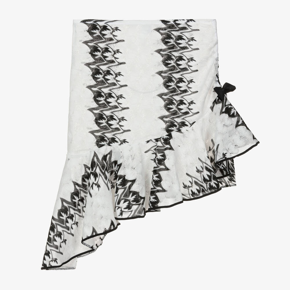 A black and white skirt for girls by Nessi Byrd, knitted in lightweight UV50 fabric for warm, sunny days on the beach. Ideal for wearing over a swimsuit or bikini, this sheer, patterned skirt has an asymmetrical hem with ruching on the front. The elasticated waistband ensures a comfortable fit and feel, while the little black bow adds a pretty finishing touch to this beach-bound style.