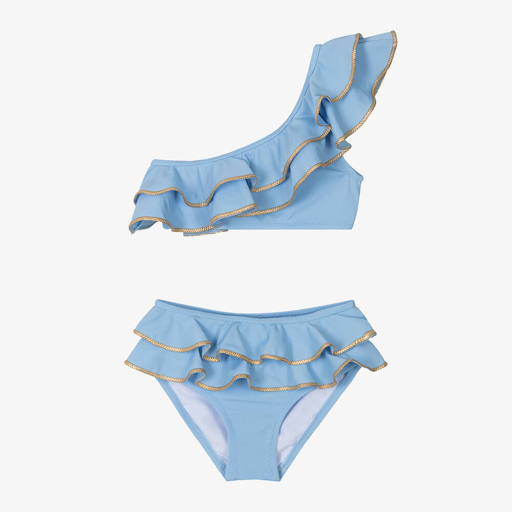 A blue bikini for girls by swimwear brand Nessi Byrd, in a silky smooth UV50 fabric with a lightweight lining. Creating a chic poolside look, the one shoulder top and high-waisted bottoms have ruffles with shiny metallic gold trims.