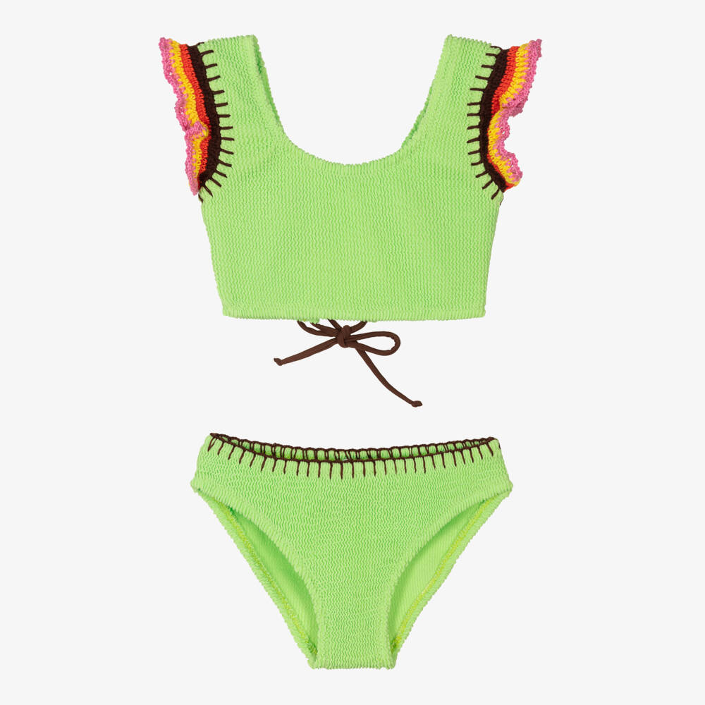 Lime green bikini for girls with a nod to the 70's by luxury American swimwear brand Nessi Byrd. Soft and stretchy, it has a wavy, ribbed texture with brown blanket stitch detailing. The top has crochet frills over the shoulders in pink, yellow, orange and brown, is lined on the front and is secured with a lace-up tie around the back. It is made in UV50 fabric.