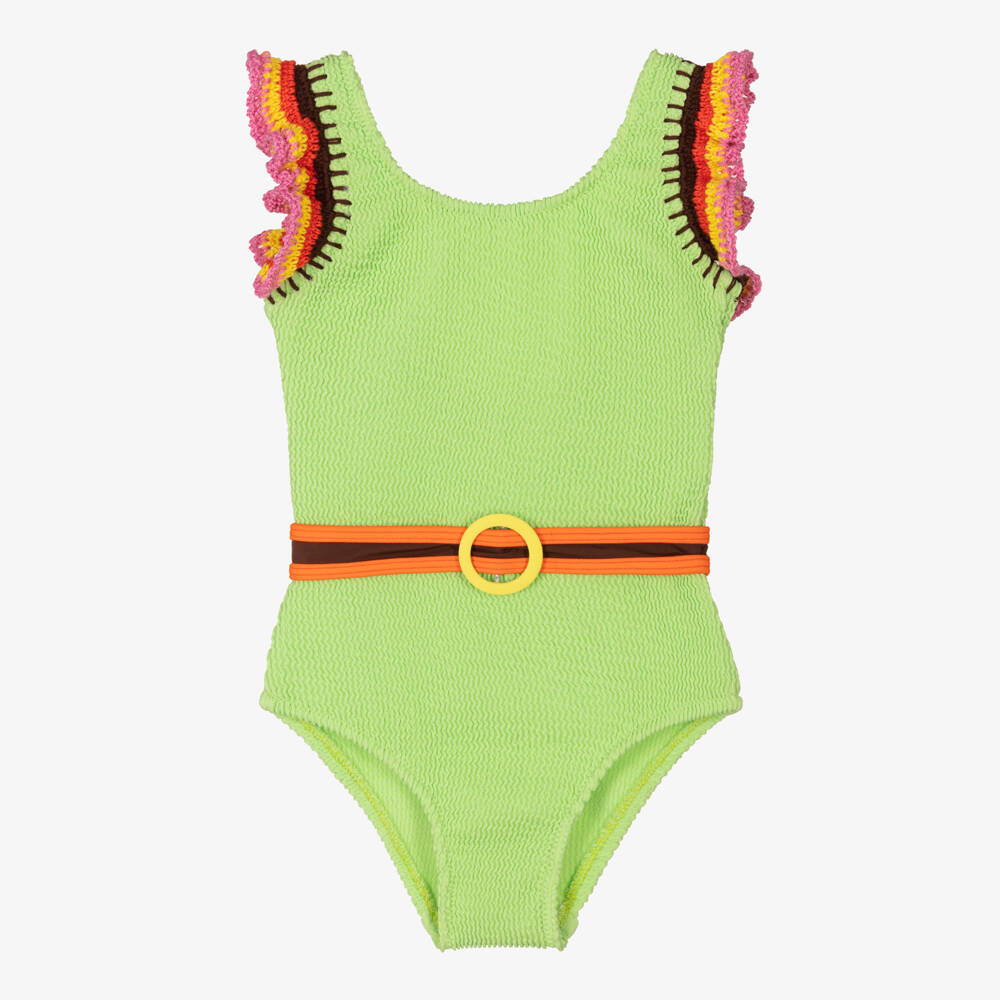 Gorgeous lime green swimsuit for girls with a nod to the 70's by luxury American swimwear brand Nessi Byrd. Soft and stretchy, it has a wavy, ribbed texture and crochet frills over the shoulders, striped in pink, yellow, orange and brown. As a cool finishing touch, there is a fixed orange and brown belt around the waist with yellow buckle detailing. It is made in UV50 fabric and is lined on the front.