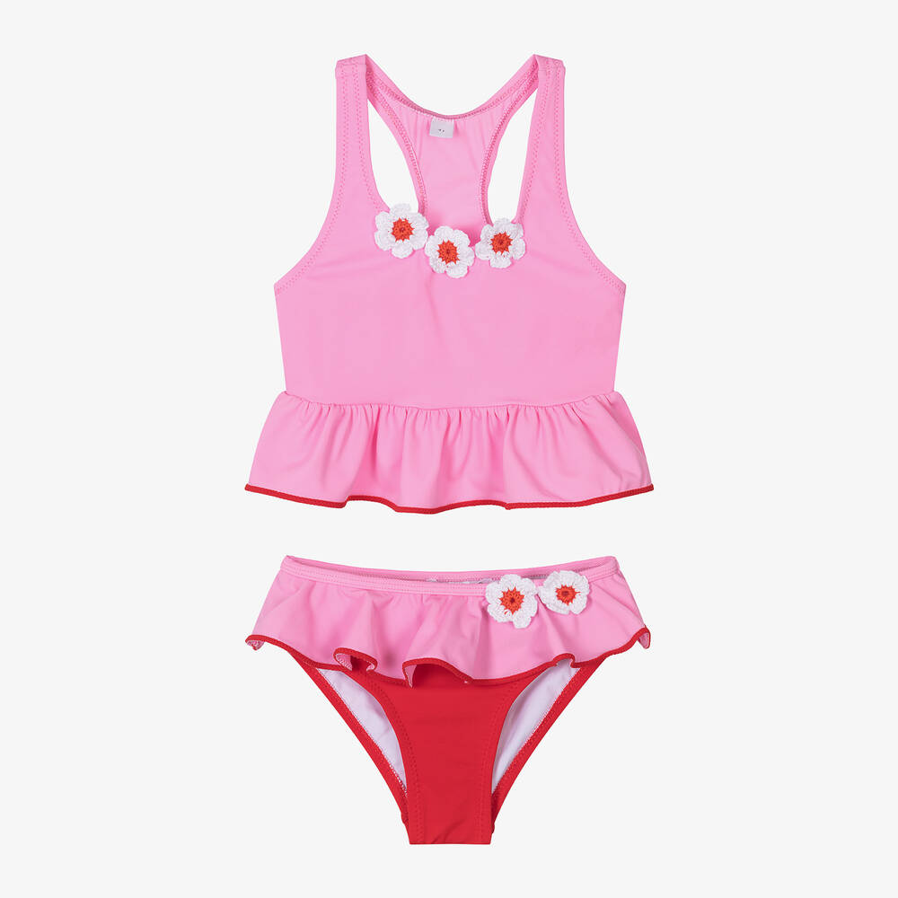 A bright pink and red bikini for girls by Nessi Byrd, made in smooth stretchy fabric with UV50. Partly lined, the top has a ruffled hem and pretty crochet flowers on the neckline. The racer-style back adds a sporty element. The matching bottoms are designed in a reverse colourway and are fully lined for comfort.