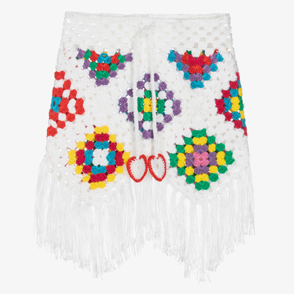 Girls off-white crochet skirt by luxury swimwear brand, Nessi Byrd. This gorgeous beachwear design has colourful geometric patterns and a fringed hemline. There is an adjustable plaited cord with crochet heart motifs at the ends for a bohemian, retro-inspired vibe.