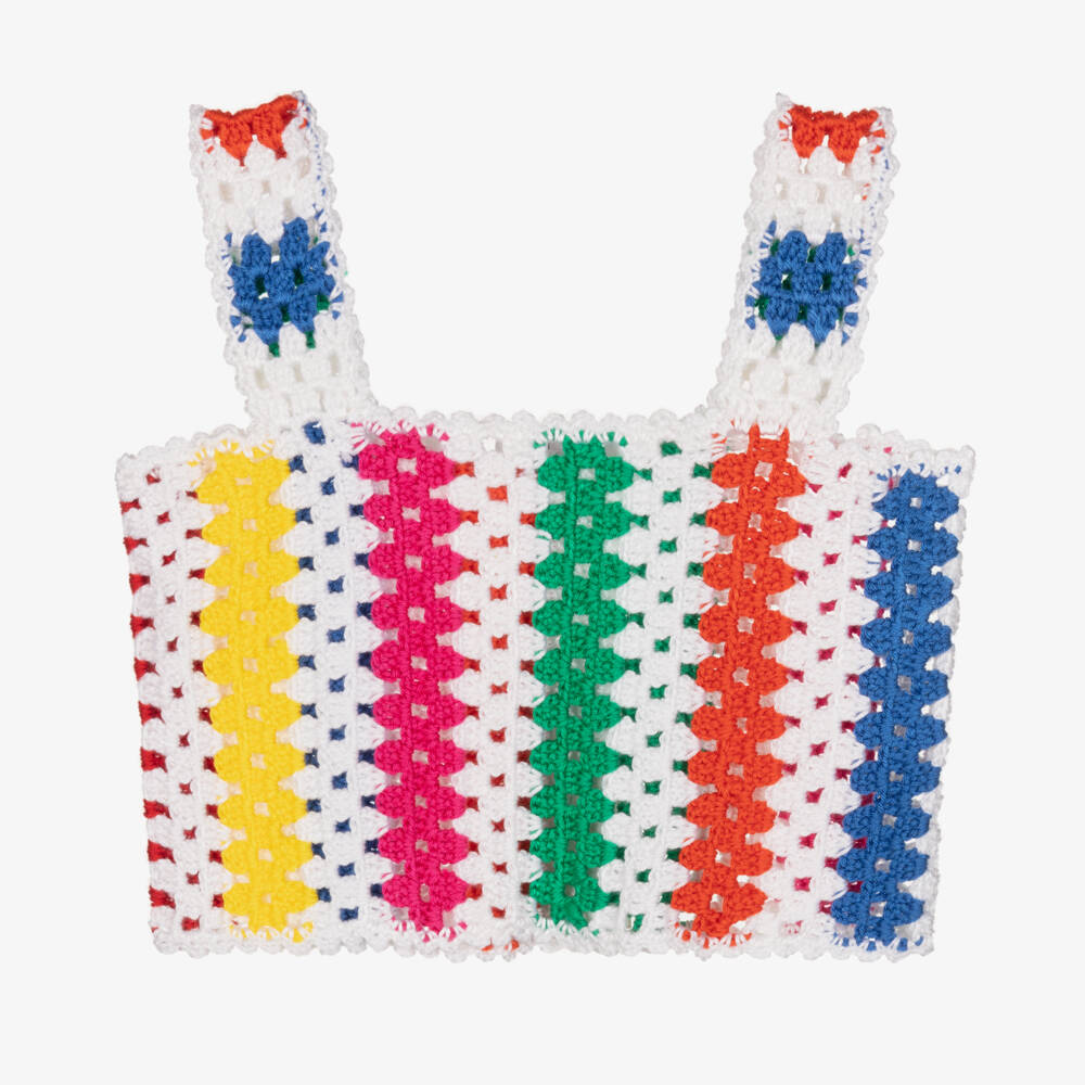 Nessi Byrd design this ivory cropped top for teen girls, knitted in bohemian-inspired crochet. Striped with bright rainbow colours for fun styling, it effortlessly layers over bikini tops for an instantly beach-bound look. This cotton style is ideal for lounging at the beach or poolside.