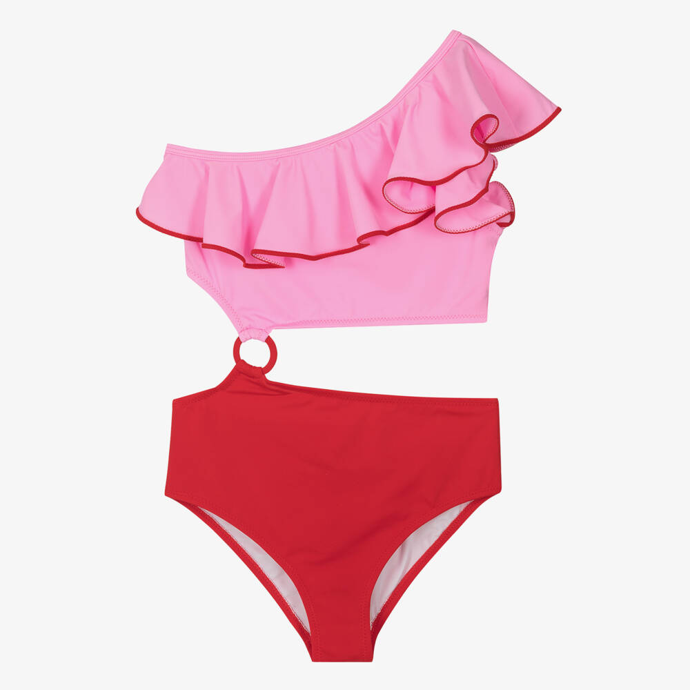 A stylish one-shoulder swimsuit for teen girls by Nessi Byrd, in a bright pink and red colourway. Open on one side, this colourblock swimsuit has a single shoulder strap with a large ruffle. There is a ring detail on the waist, attaching the top and bottom. Lined for comfort, it is made in smooth and stretchy fabric with UV50.
