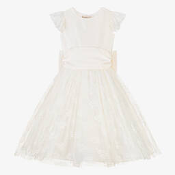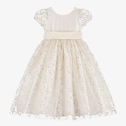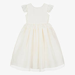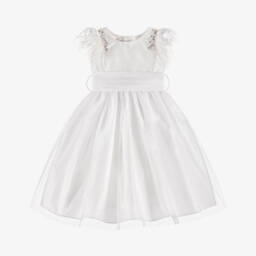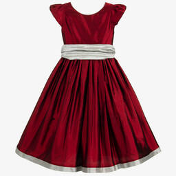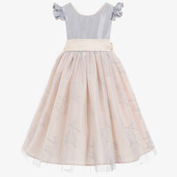 Enchanting pink dress for girls by British brand Nicki Macfarlane. It is made in silky taffeta with a beautiful tulle overlay that has floral embroidery sparkling with glittery silver thread. The dress is styled with a band of dark pink crystals on the bodice that twinkle in the light and gathered angel sleeves. Lined in lightweight voile for comfort, the dress has a full, gathered skirt and a discreet, concealed back zip fastening.