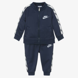Pale blue tracksuit for baby boys by Nike, made in a soft cotton jersey blend with a fleecy inside. Designed for an oversized fit, the crew neck sweatshirt has dropped shoulder seams and an embroidered Swoosh logo on the front. Poppers on the back make it easier to get on and off over the head. Matching joggers are elasticated on the waist and cuffed on the ankle for comfort all day long.