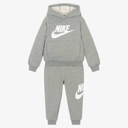 A black tracksuit for boys and girls by Nike, made from soft cotton jersey with a warm fleecy interior. Both pieces are printed with a bold white Swoosh logo for an iconic look. The hoodie has a useful pouch pocket on the front and the joggers have a comfortable elasticated waist.