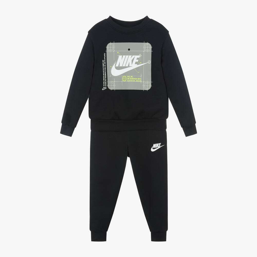 A casual black tracksuit for boys by Nike, made in a mid-weight cotton jersey blend for comfortable wear. Fleecy on the inside, the long-sleeved sweatshirt has a crew neckline and snug ribbed trims. A grey target graphic is printed on the front, featuring the American brand's Swoosh logo and the address of their global headquarters. The matching joggers have further branding on the leg and a stretchy waistband for ease of movement.