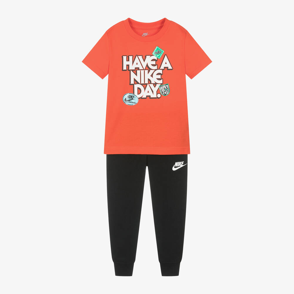 An orange T-shirt and black joggers set for boys by sportswear brand Nike. Casual and comfortable, both pieces are made in soft cotton jersey. The T-shirt has a ribbed crew neckline, with a bold white slogan and Swoosh logos printed on the front. The joggers have a gently elasticated waist and a single white Swoosh logo printed on one leg.