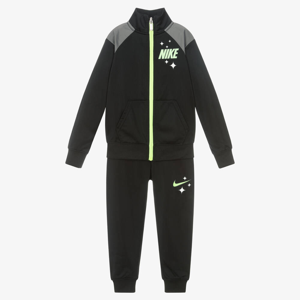 Black tracksuit for boys from American sportswear brand Nike, with neon green and white logo prints. The high neck top has a bright neon green zipper, patch pockets and grey panels on the shoulder. The joggers are cuffed at the ankle, easy pull-on with the gently elasticated waistband and have the brand's Swoosh logo print on one leg. Both pieces are made in smooth jersey with a slight sheen for that retro look and a soft fleecy underside for comfort.