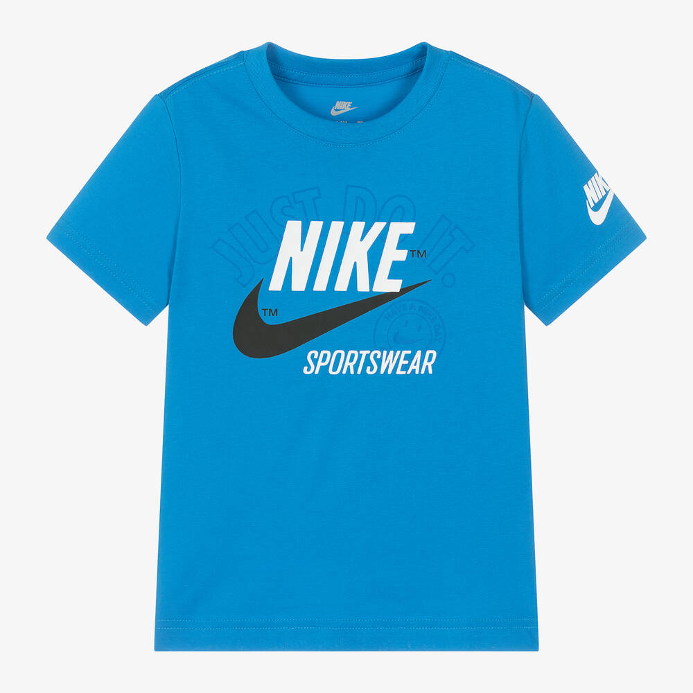 Bright blue short-sleeved T-shirt for boys from Nike, made in soft, stretchy cotton-blend jersey. White and black Swoosh branding is printed on the front and one sleeve, adding instant designer appeal.