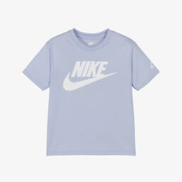 Blue cotton-blend T-shirt for boys by Nike, made in soft jersey for comfortable wear. This casual tee has a bold graphic print on the front, featuring the brand's iconic Swoosh logo in white together with an array of colourful Swoosh graphics.
