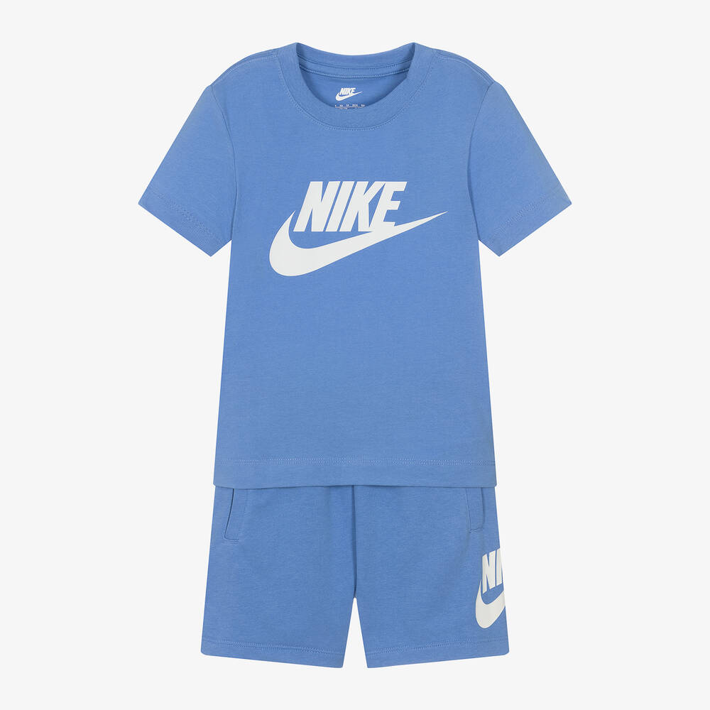 Nike designs this blue shorts set for boys. Super comfortable in cotton-blend jersey, both have bright white Swoosh branding for that signature sportswear look. The T-shirt has short sleeves and the shorts have an elasticated waist, with useful pockets below.