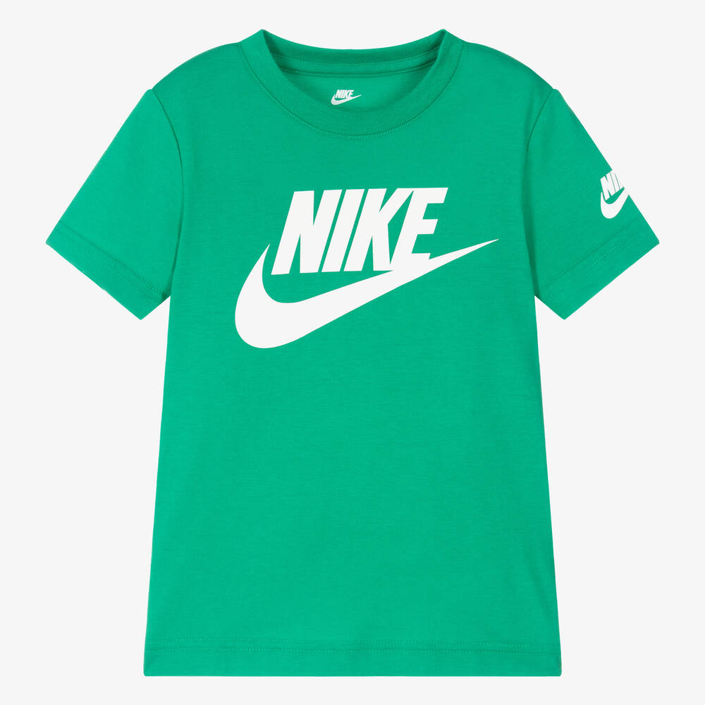 Green cotton-blend T-shirt for boys by American sportswear brand Nike. Made in comfortable jersey, it is printed with the iconic Swoosh logos in white.