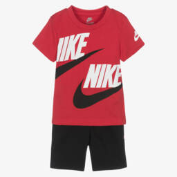 Red and black shorts set for boys by Nike, made in a comfortable cotton blend. This casual outfit set includes a short-sleeved T-shirt, branded with the signature Swoosh logos. The paired shorts have an elasticated waistband and a cool velcro pocket on the leg.