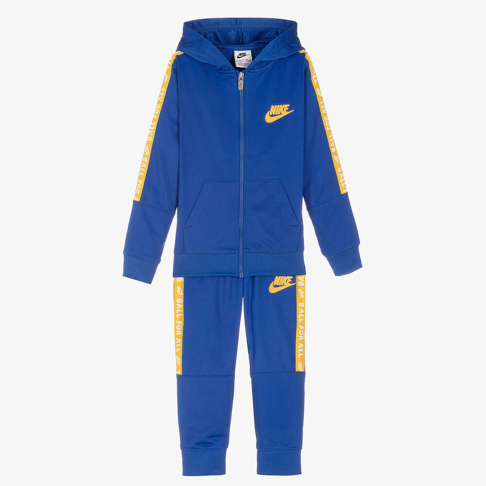 Bright royal blue hooded tracksuit for boys by American sportswear band Nike. Easy and comfortable to wear, it is made in silky polyester jersey, with yellow Swoosh logo prints and BALL FOR ALL taped trims. The zip-fastening top has a branded puller, a handwarmer pouch pocket on the front, and a BALL FOR ALL design on the back. The joggers have a comfortable elasticated waist.