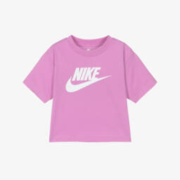 Pink T-shirt for girls by Nike, made in soft cotton-blend jersey for comfortable wear. This casual tee has a relaxed, boxy silhouette, with a crew neckline and dropped shoulders. A bold white Swoosh logo is printed on the front for instant brand appeal.