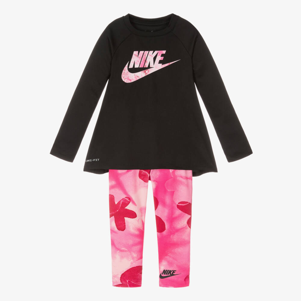 In pink and black, this activewear top and leggings set for girls is by American sportswear brand Nike. The stretchy jersey fabric uses Dri-FIT technology to wick moisture away, keeping the wearer dry and comfortable. The full length leggings are patterned in a pretty pink and red print, with a gently elasticated waist and a Swoosh logo on one leg. The black top has a coordinating pink logo on the front.