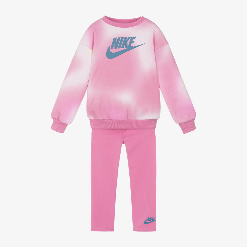 Sporty, pink cotton leggings set for girls by Nike. Made in mid-weight jersey with a soft, fleecy inside, the long-sleeved top has an ombré effect pattern in pink and yellow. It is casually styled with ribbed trims and for designer appeal, has a blue Swoosh logo printed on the front. Smaller sizes fasten with poppers on the back. The stretchy jersey leggings have a gently elasticated waistband, with matching branding just above the hem.