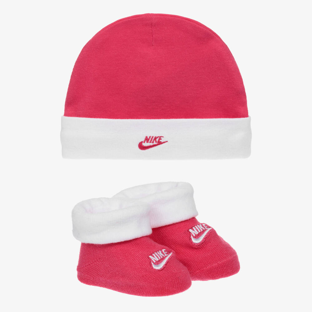 Baby girls magenta pink and white hat and bootie set by Nike, made in soft, stretchy cotton jersey. They have matching white turn back trims with the brands white Swoosh logo embroidered on the toes of the booties and a pink logo on the front of the hat.