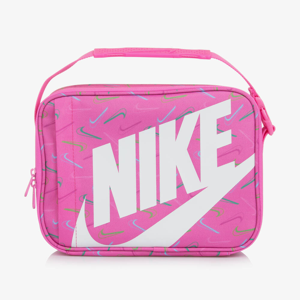 Bright pink lunch bag for girls by American brand Nike, with a green and blue pattern of the iconic Swoosh logo and a large logo printed across the front in white. It is made in durable canvas over a hard shell liner with insulation to help keep contents cool. It has zip fastenings, a smooth, simple-to-clean, silver lining and an internal mesh side pocket. There is a further, zipped, slide pocket on the front and a clip-fastening, webbed carry handle on top, with an easy-grip, central rubber section.