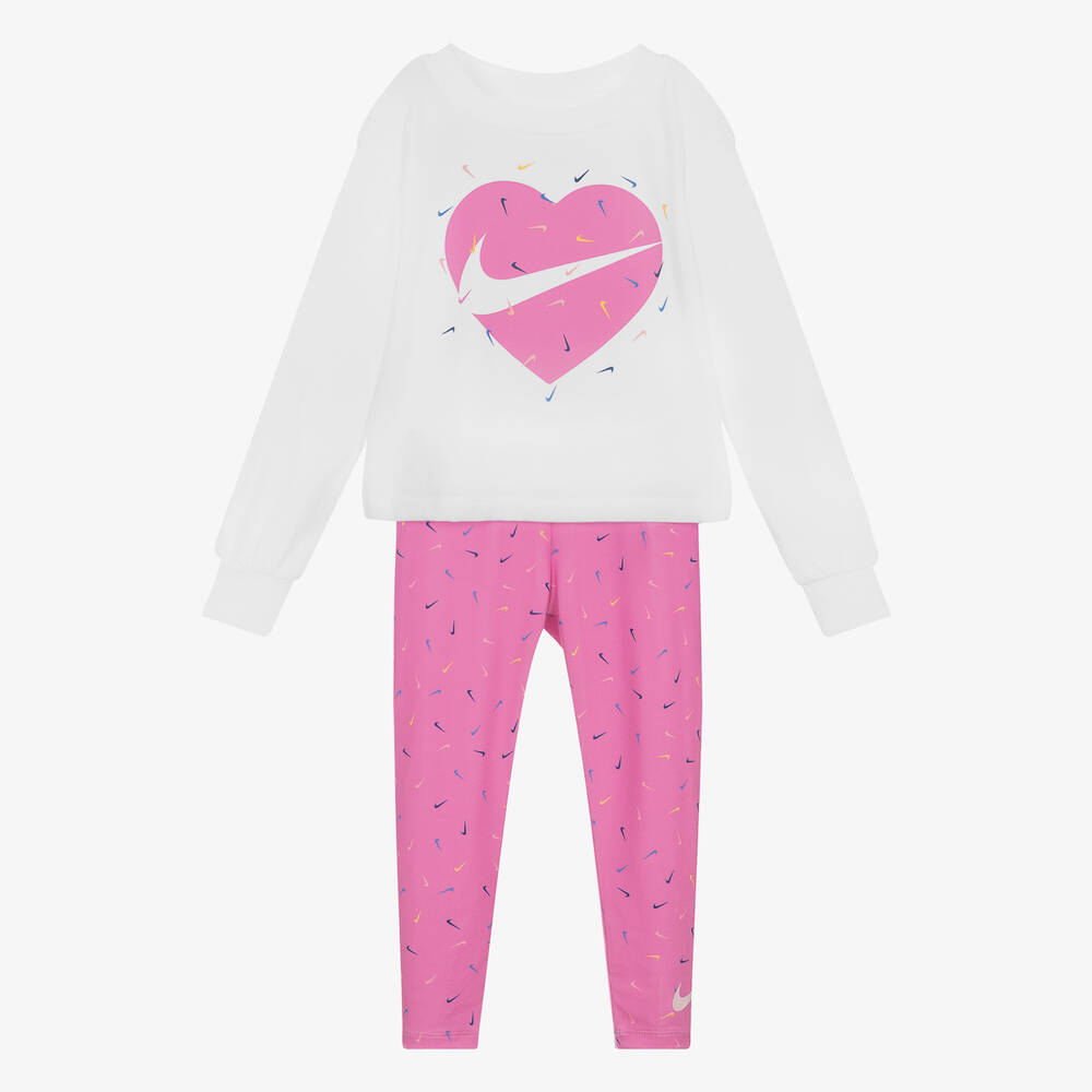In pink and white, this activewear top and leggings set for girls is by American sportswear brand Nike. The top is made in soft cotton jersey, with a fun heart and Swoosh logo motif on the front. Silky soft and stretchy, the full length leggings are designed with Dri-FIT technology to wick moisture away, keeping the wearer dry and comfortable. They are patterned in tiny Swoosh logos and have a gently elasticated waist.