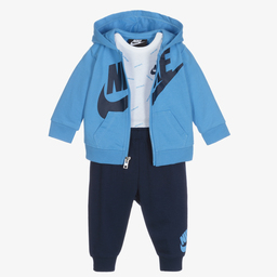 Grey and black tracksuit set for little boys by Nike, made in comfortable cotton sweatshirt jersey. The grey hoodie has a neon green Swoosh logo and a front zip fastening. The black have an elasticated waistband and a green logo print. The white bodyvest has an all-over logo print and popper fastening between the legs.