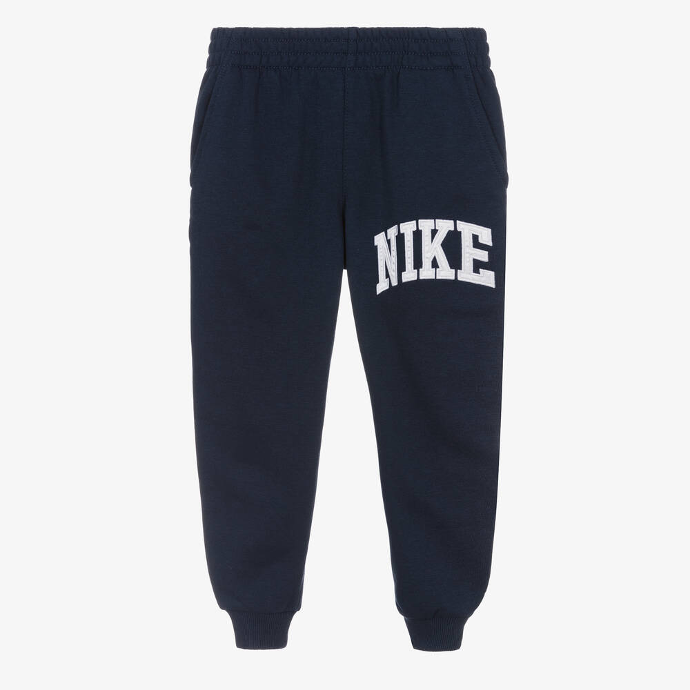 Casual navy blue joggers for boys and girls by American brand Nike, made in soft, cotton blend jersey. Warm and fleecy on the inside, they have an elasticated waistband for a comfortable fit and slanted front pockets. A shimmery silver logo appliqué adds instant designer appeal.