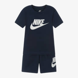 Navy blue shorts set for boys and girls by Nike, made in a soft cotton jersey blend. This casual outfit includes a short-sleeved T-shirt with a bold Swoosh logo on the front. The matching shorts have a stretchy waistband and front pocket detail for day-to-day essentials.
