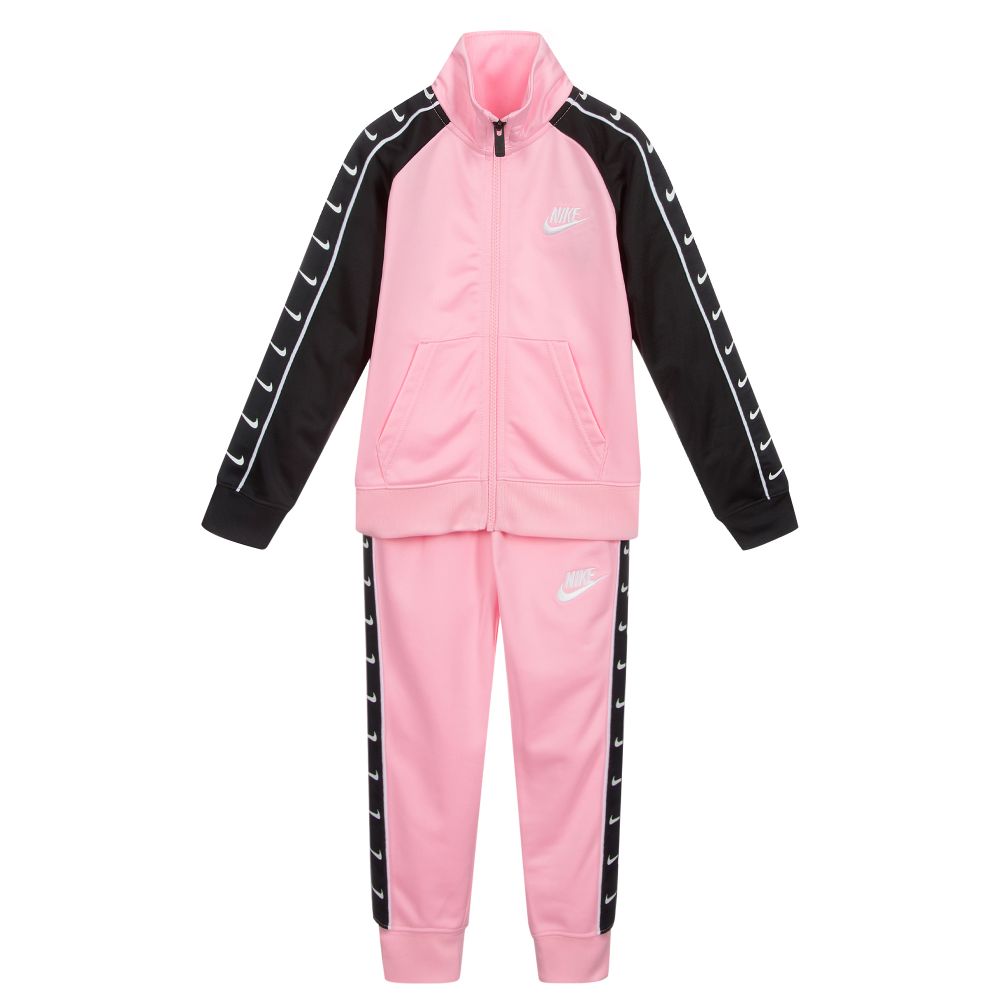 Girls pink and black tracksuit by Nike. It is made in silky smooth polyester, with white logo printing down the sides. The zip-fastening top has a pouch pocket on the front and the joggers have a comfortable elasticated waistband. Both pieces have white swoosh logo embroidery.