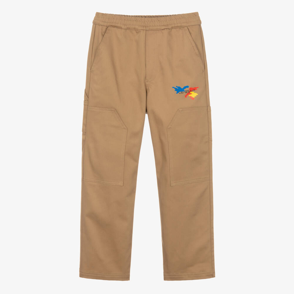 Beige cargo-style trousers for boys by Italian brand Off-White, with the designer's black logo on one leg, surrounded by navy blue, red and yellow paint splashes. Made in soft, cotton twill, there are two slanted pockets on the front and five pockets on the back, with patches on the knees and a comfortable, elasticated waistband. Easy to wear, they simply pull up.