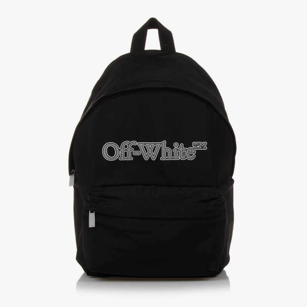 Boys black backpack by luxury brand Off-White, boldly branded with a grey bookish logo on the front. Accessorizing any streetwear look, this zip-up bag is made in silky smooth fabric with a lined main compartment. It has an interior slip pocket and an extra zip pocket on the front for more storage space. The fully adjustable straps have tonal webbed trims with jacquard logo lettering.