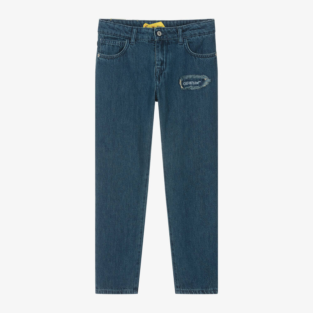 Mid-blue denim jeans for older boys, by luxury designer Off-White. These signature jeans feature a frayed bookish logo patch on the front and iconic diagonals on the back of the legs. They have classic five-pocket styling and an adjustable waistband to alter the fit as they grow. Finished with silver hardware, they fasten with a branded button and a concealed zip on the front.