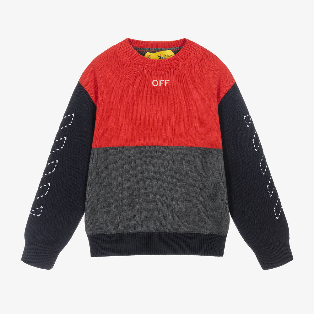 In red, grey and navy blue, this colourblock sweater for boys is by Off-White. Cosy and comfortable, it is knitted in a soft cotton and wool blend. The brand's stitch embroidery is featured on the back and sleeves, with their signature Off Stamp logo on the chest.