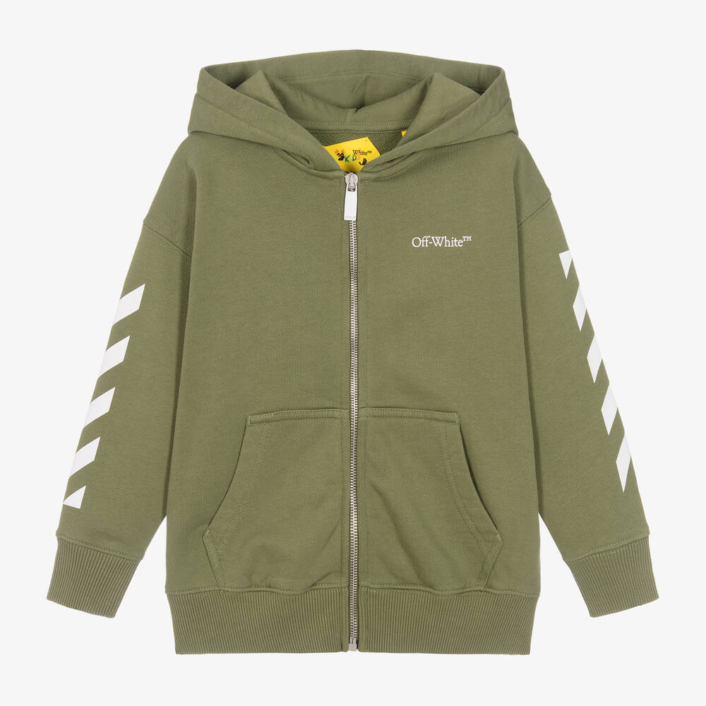 Cool khaki green zip-up hoodie for boys by Italian brand Off-White, with a logo on the front and the designer's bold iconic arrows and diagonals on the back and sleeves, all printed in white. It is made in comfortable jersey with cosy, ribbed trims and a fleecy inside, just right for relaxed days. There are useful pouch pockets on the front. This garment is made with 72% organic cotton.