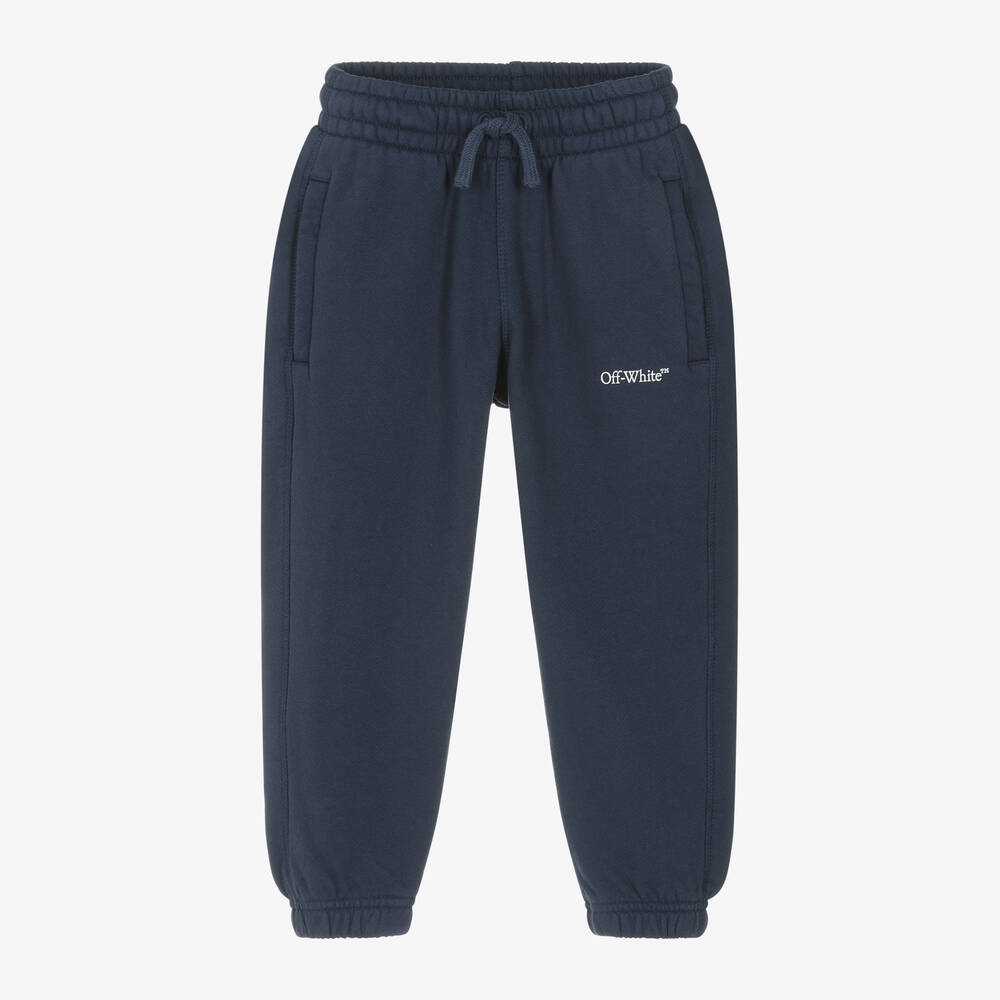 Navy blue mid-weight cotton joggers for boys by Off-White, made in comfortable jersey with a cosy, fleecy inside. Unmistakably by the brand, they have the white bookish logo printed on one side and the diagonals logo on the back of the legs. An elasticated, drawstring waist provides a good fit, and there are useful pockets on the front.