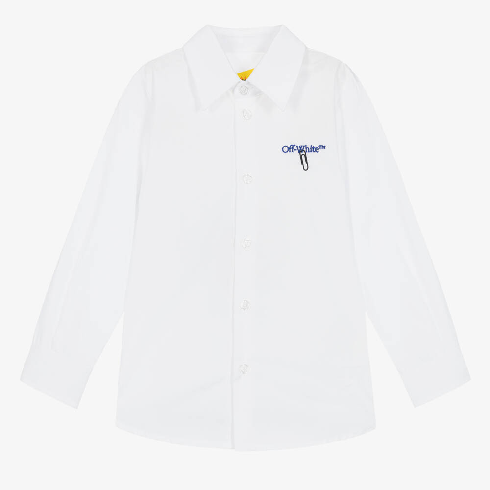 White cotton shirt for boys from Italian brand, Off-White. Made in soft cotton poplin with a pointed collar, this smart shirt has an embroidered logo and paperclip motif on the chest in blue and black. For a designer finishing touch, it fastens with branded buttons.