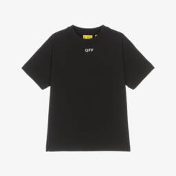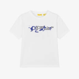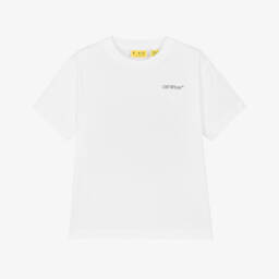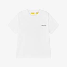 White cotton T-shirt for boys by Off-White, inspired by the adult collection. This casual tee features the brand's distinctive wraparound text logo in bold black font for instant brand recognition. It is made in soft jersey for comfortable wear.