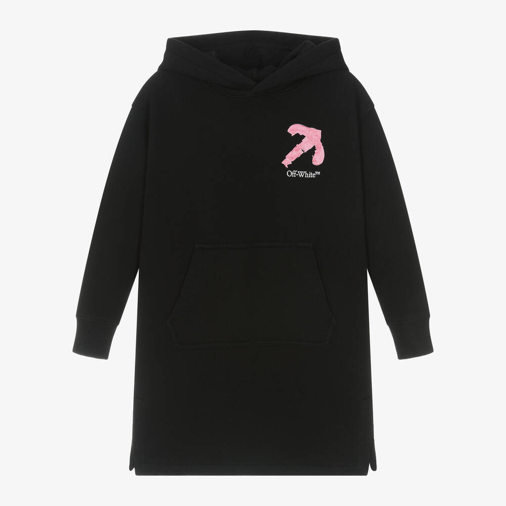 Black cotton hooded dress for girls by cool streetwear label Off-White. For instant designer recognition, it has the iconic painterly logo, a variation on the designer's arrow branding, on both the front and back, in pink and white. It is made in soft, sweatshirt jersey, with a comfortable lining in the hood, long sleeves and cosy, ribbed cuffs. There is a useful pouch pocket on the front and vents on the side seams to allow lots of movement.