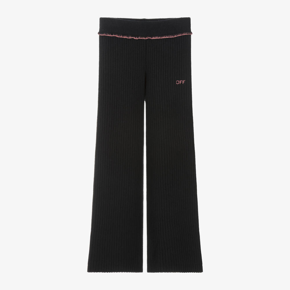 Gorgeous black ribbed knit trousers for girls by Off-White, with an Off Stamp logo embroidered in pink on one leg. Made in a mid-weight wool and cotton blend, they have a wide-leg fit and a comfortable, elasticated waistband with pink blanket stitch detailing.